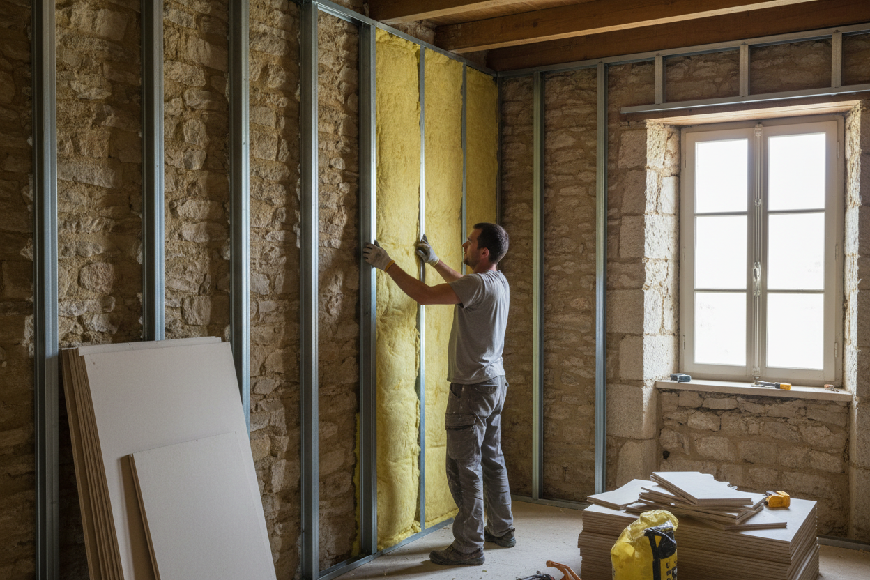 Quand le mur est trop irrégulier pour coller — et c'est souvent le cas dans les bâtisses anciennes d'Arles —, on monte une ossature métallique devant le mur. Des montants en acier galvanisé fixés au sol et au plafond, de la laine minérale calée entre les montants, une plaque de plâtre vissée devant. C'est la technique de référence pour les murs en pierre brute, les murs humides, les murs avec des passages de gaines. Plus épaisse que le doublage collé, mais plus polyvalente. On gère les défauts d'aplomb sans problème.