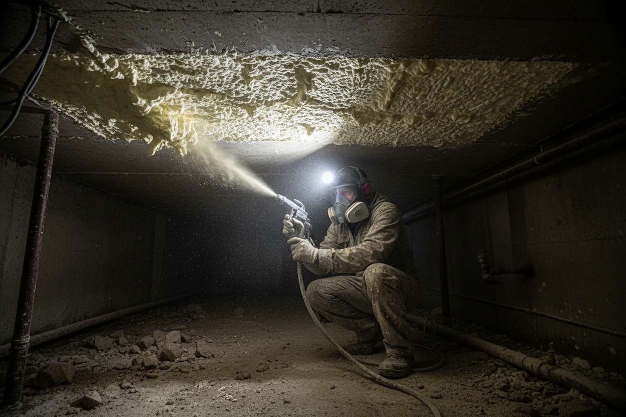 Le flocage consiste à projeter un isolant fibreux ou pâteux sous la dalle du rez-de-chaussée, depuis le sous-sol ou le vide sanitaire. C'est rapide — un artisan traite 80 à 100 m² dans la journée. Beaucoup de maisons à Pont-de-Crau et dans les lotissements autour de Raphèle ont un vide sanitaire accessible. On s'y glisse, on projette, c'est fait. Les pieds froids en hiver, c'est terminé. À Arles, le sol reste frais même en été grâce à la nappe phréatique proche, mais en hiver le carrelage sur dalle non isolée devient glacial.