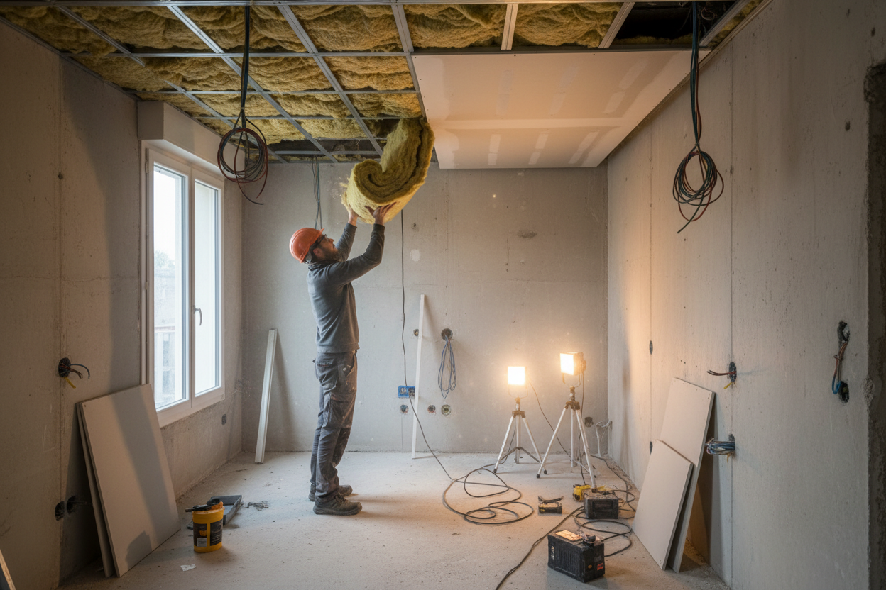 Quand la hauteur sous plafond est limitée, on colle des panneaux isolants directement contre le plafond existant. Polystyrène expansé ou polyuréthane, 6 à 10 cm d'épaisseur, fixés au mortier-colle et chevillés. On perd moins de place — c'est l'avantage principal. La performance thermique sera moindre qu'un faux plafond épais, mais pour un appartement dans les HLM de Griffeuille ou un logement à Barriol, ça améliore nettement le confort. La surface du plafond doit être propre, plane et saine. Sur un vieux plâtre qui s'effrite, ça ne tient pas. Il faut d'abord assainir.
